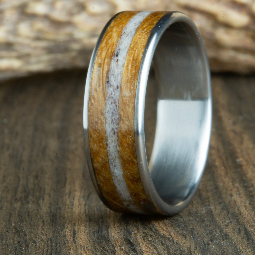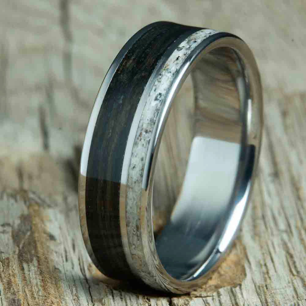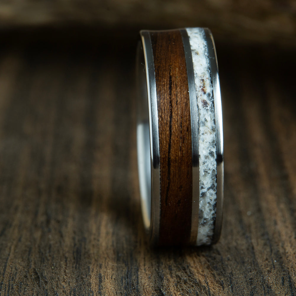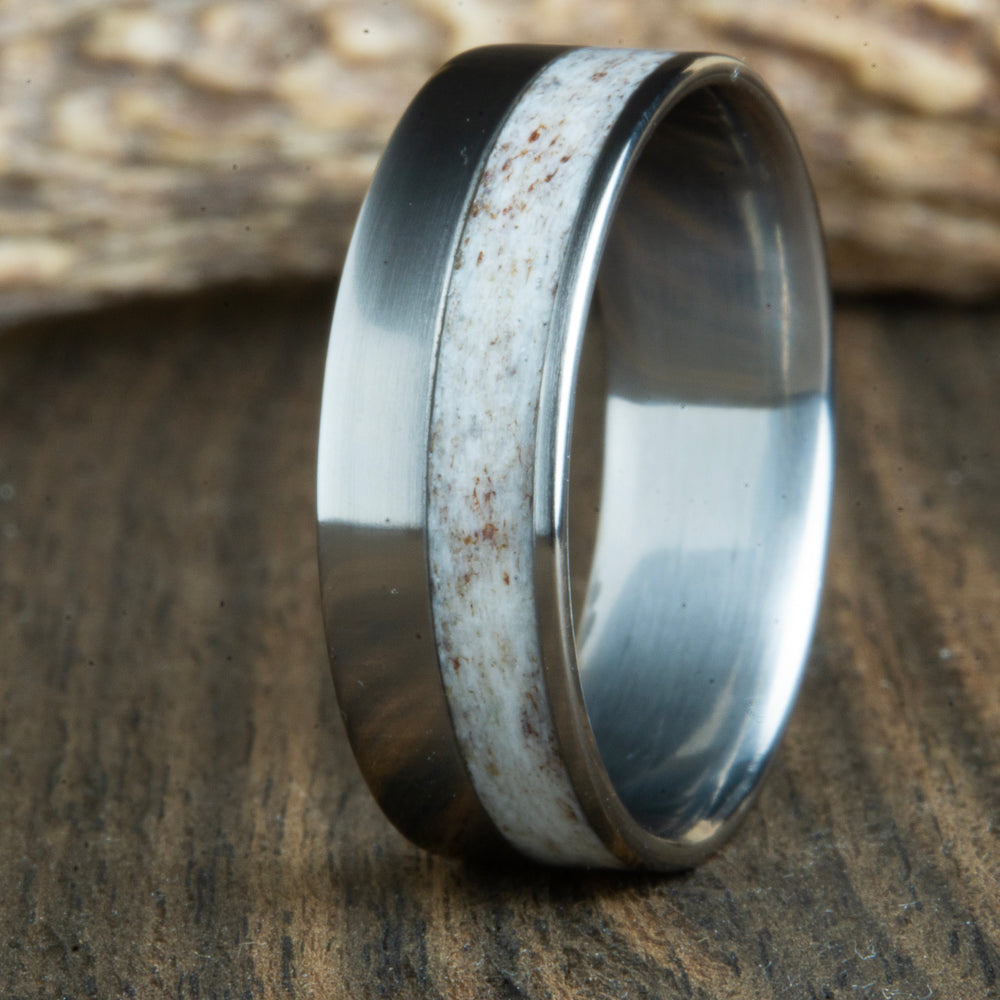 Custom handcrafted deer antler rings made entirely in the Peacefield Titanium shop. We craft every mens ring with made in the USA titanium bar stock 6al-4v, the most durable scratch resistant variety of titanium.
