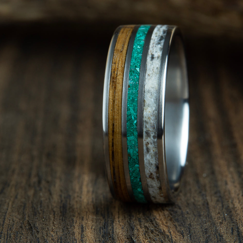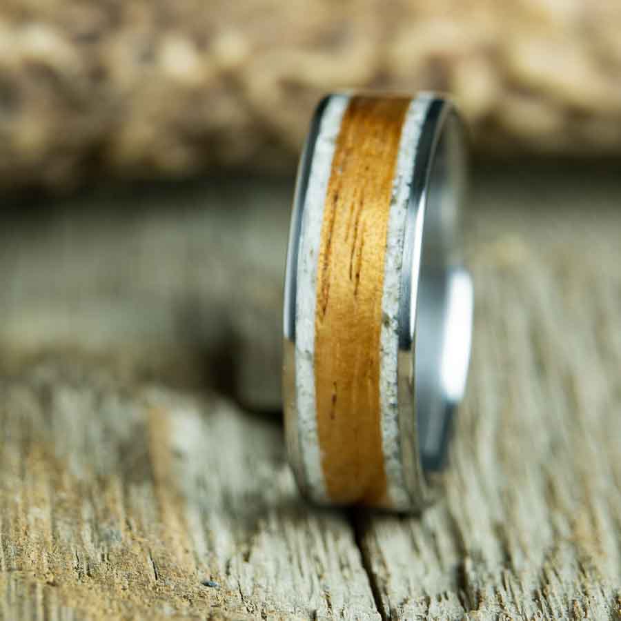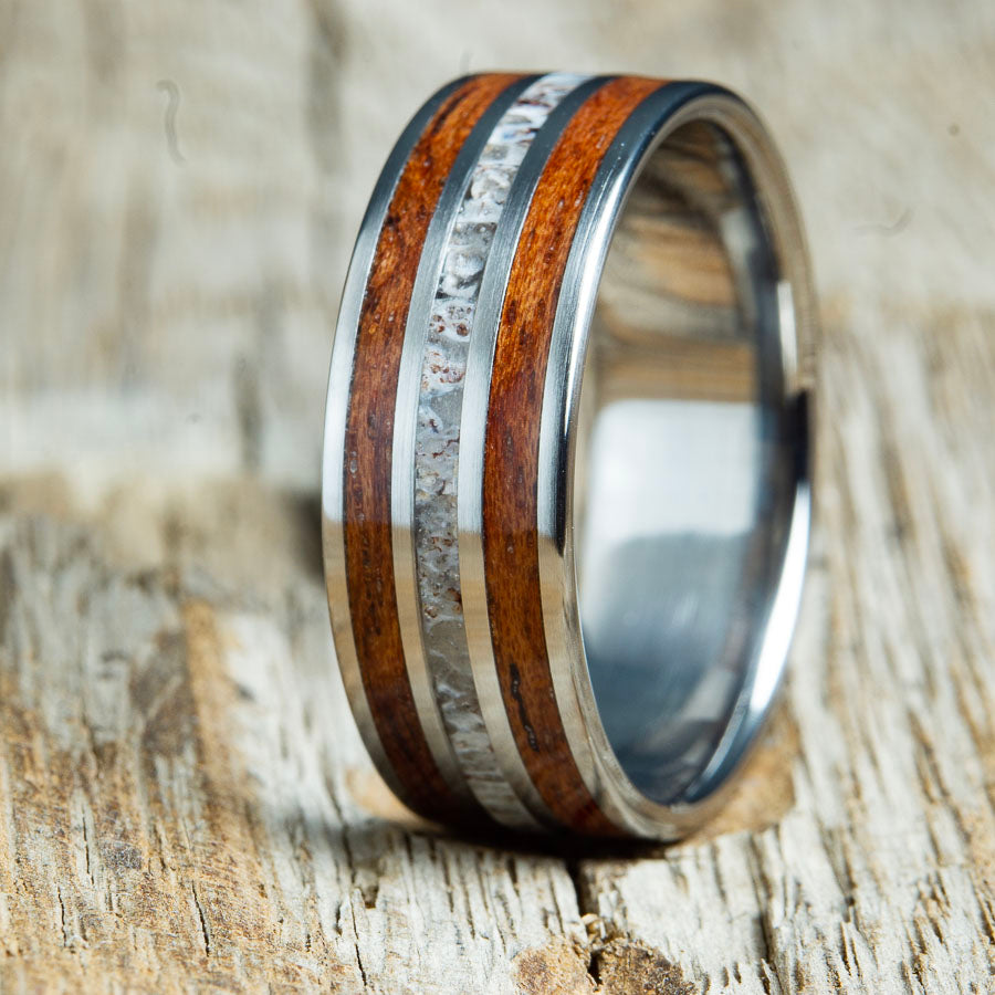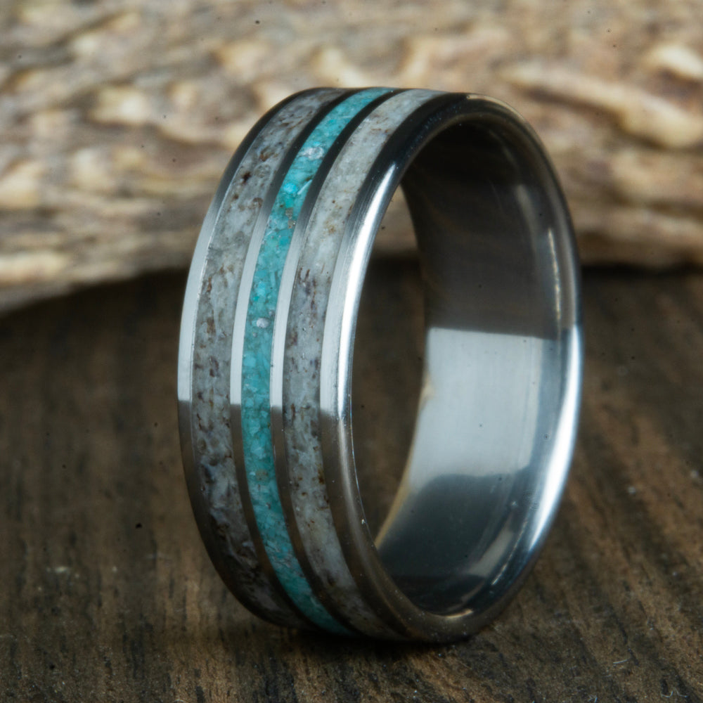 Custom handcrafted deer antler rings made entirely in the Peacefield Titanium shop. We craft every mens ring with made in the USA titanium bar stock 6al-4v, the most durable scratch resistant variety of titanium.