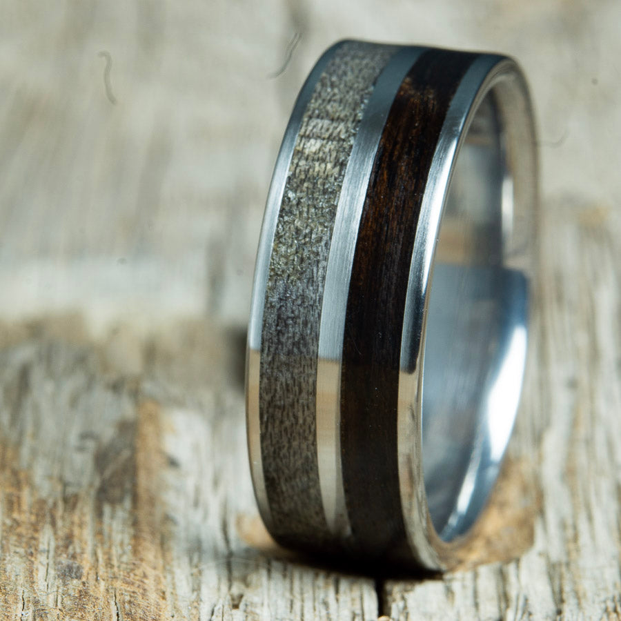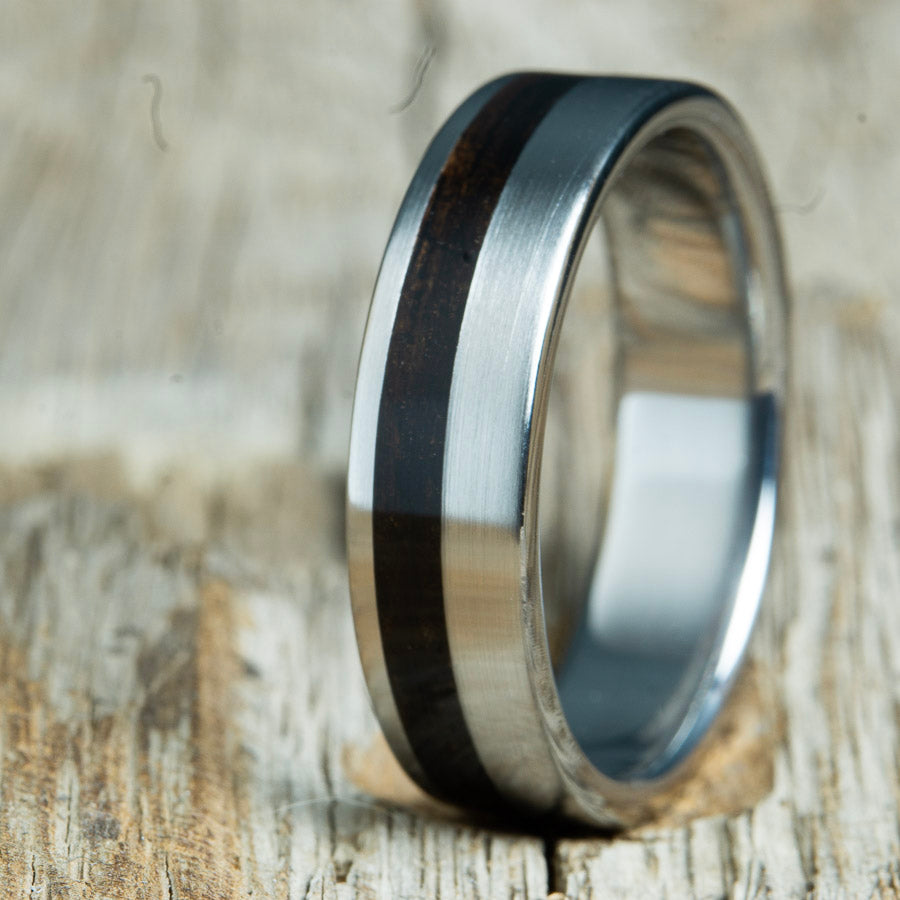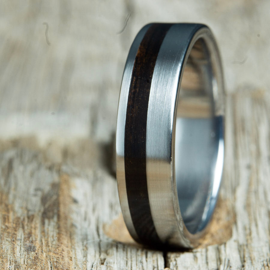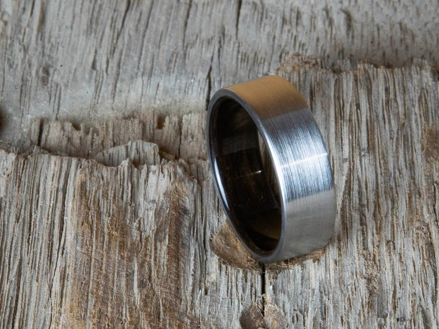 Ebony rings handcrafted by Peacefield Titanium. The rings in this collection feature gorgeous Ebony wood from Africa. Ebony is a dense and durable wood used for thousands of years for furniture and art.
