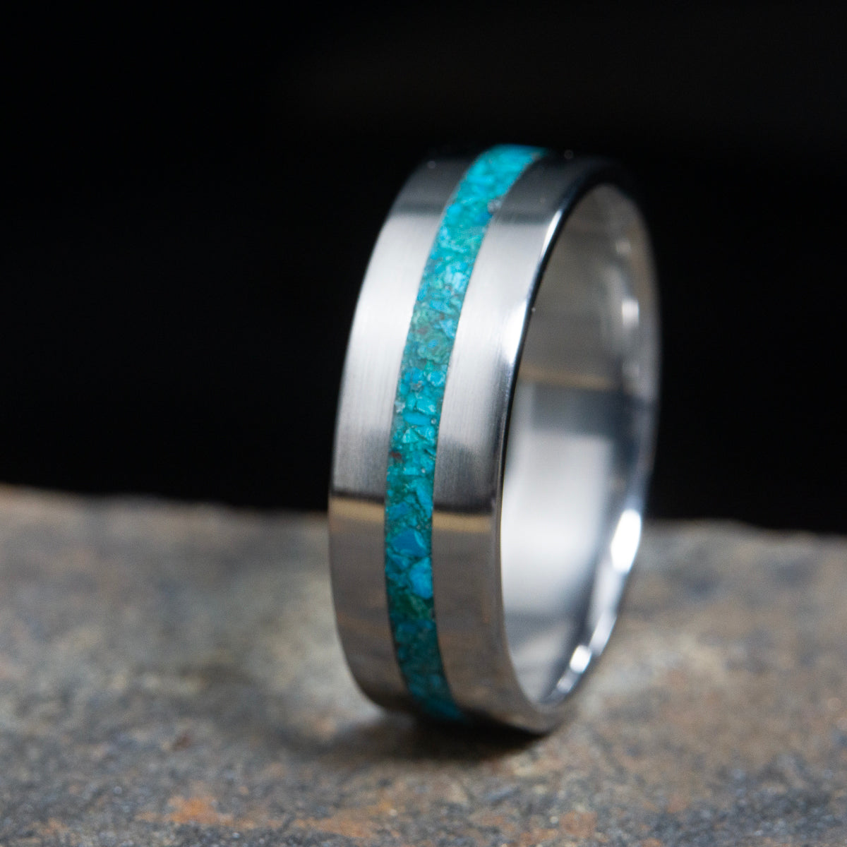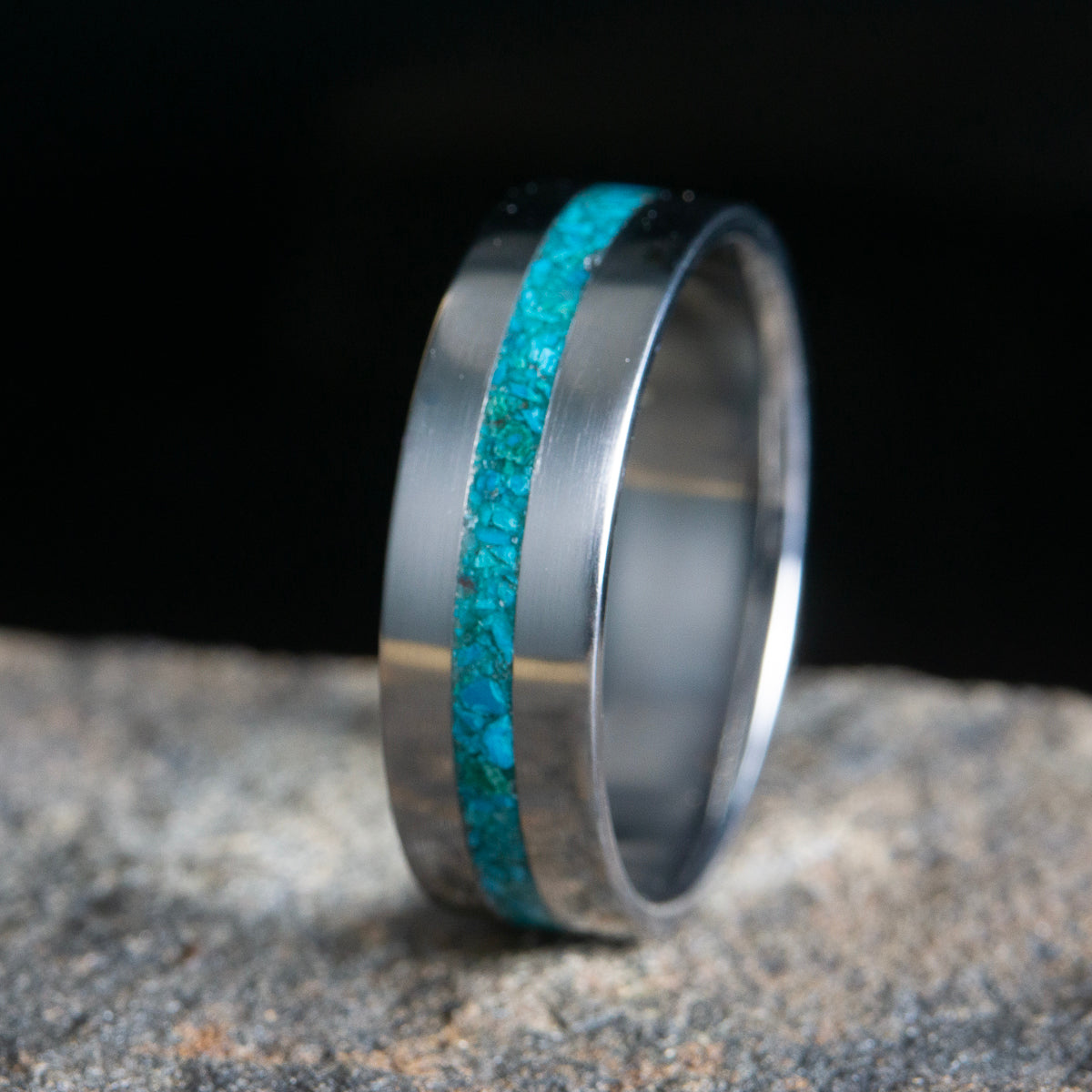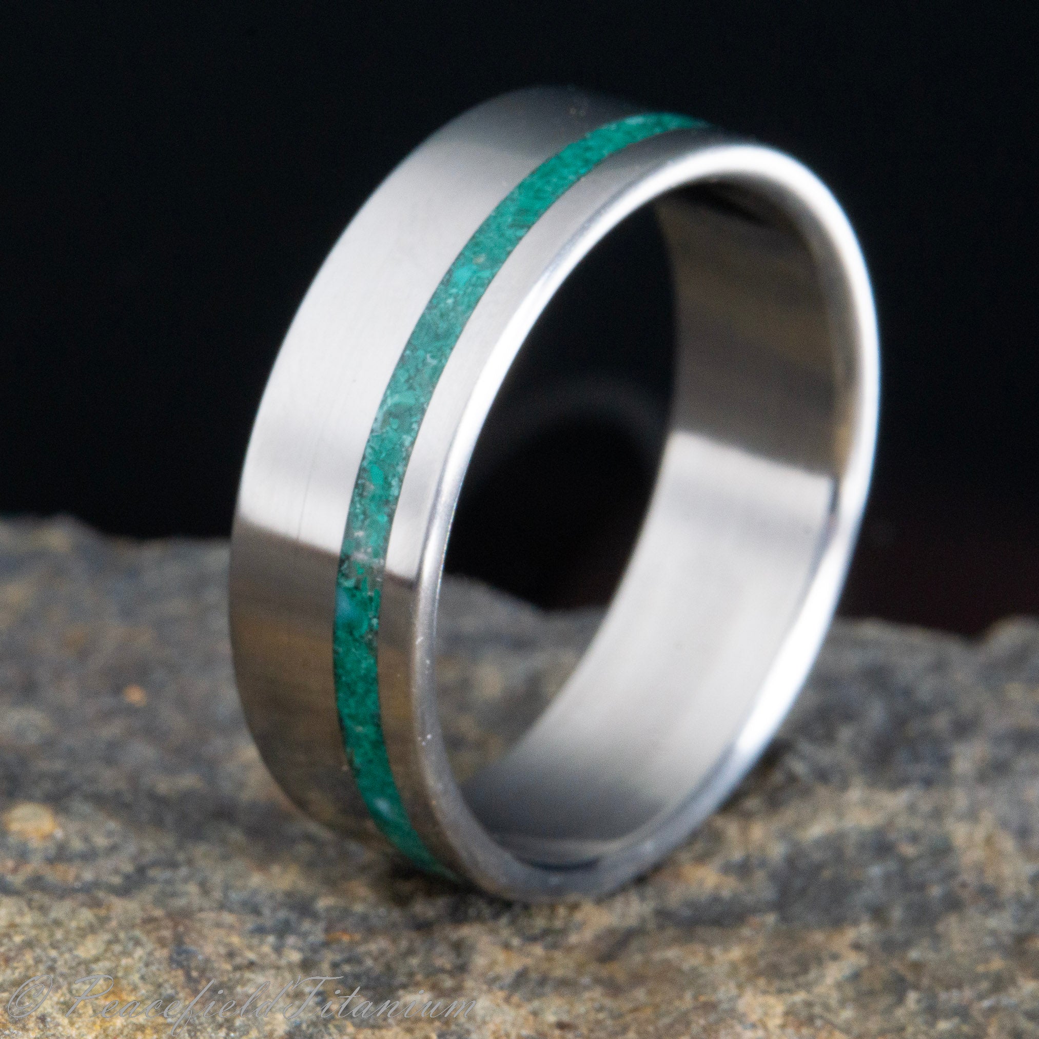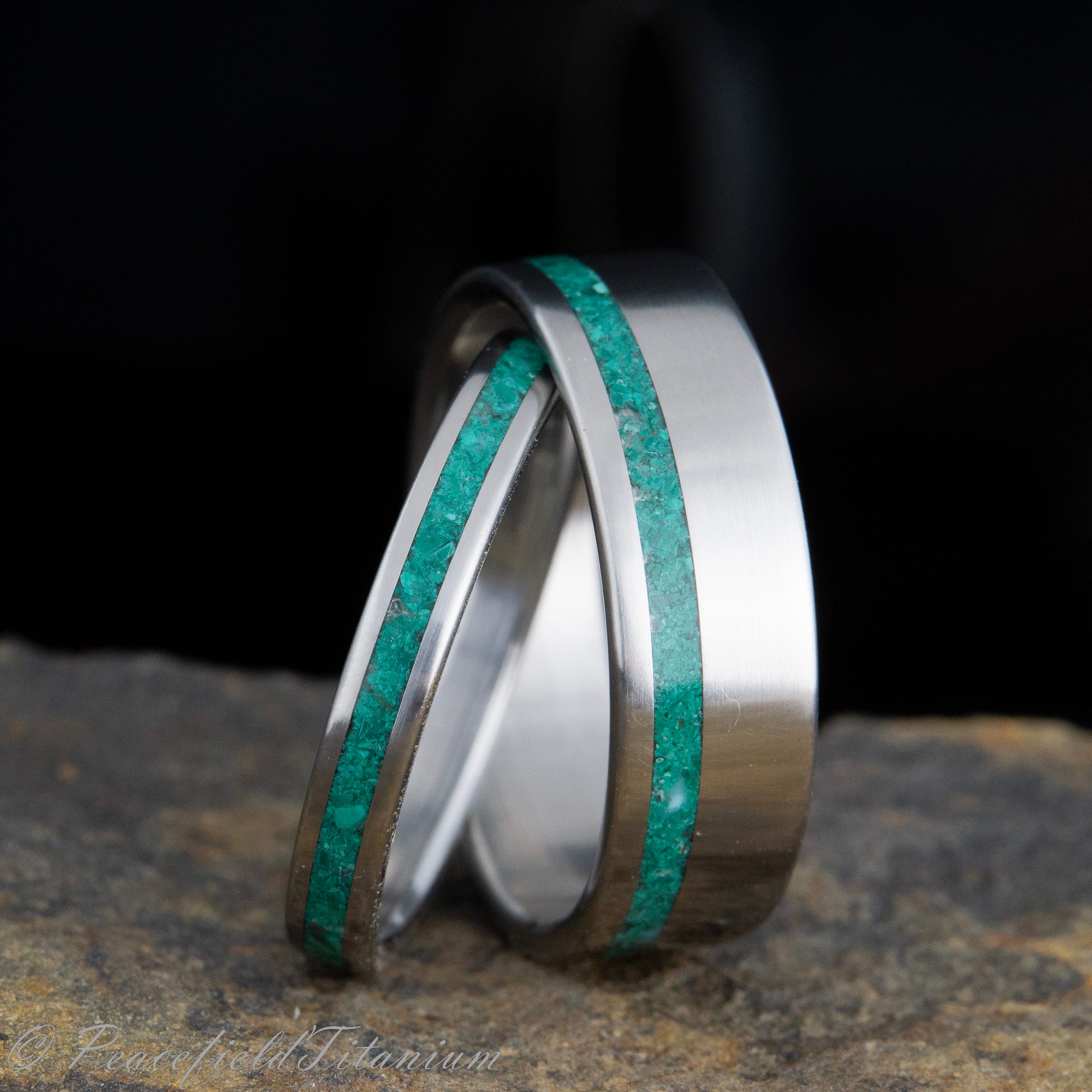 Our Titanium rings with natural stone inlays. These include rings with Malachite, turquoise, lapis lazuli, mother of pearl, and more. We are constantly adding fresh new wedding band styles to these collections. We pair up rings for wedding band sets and you can always combine two for your own personal touch.