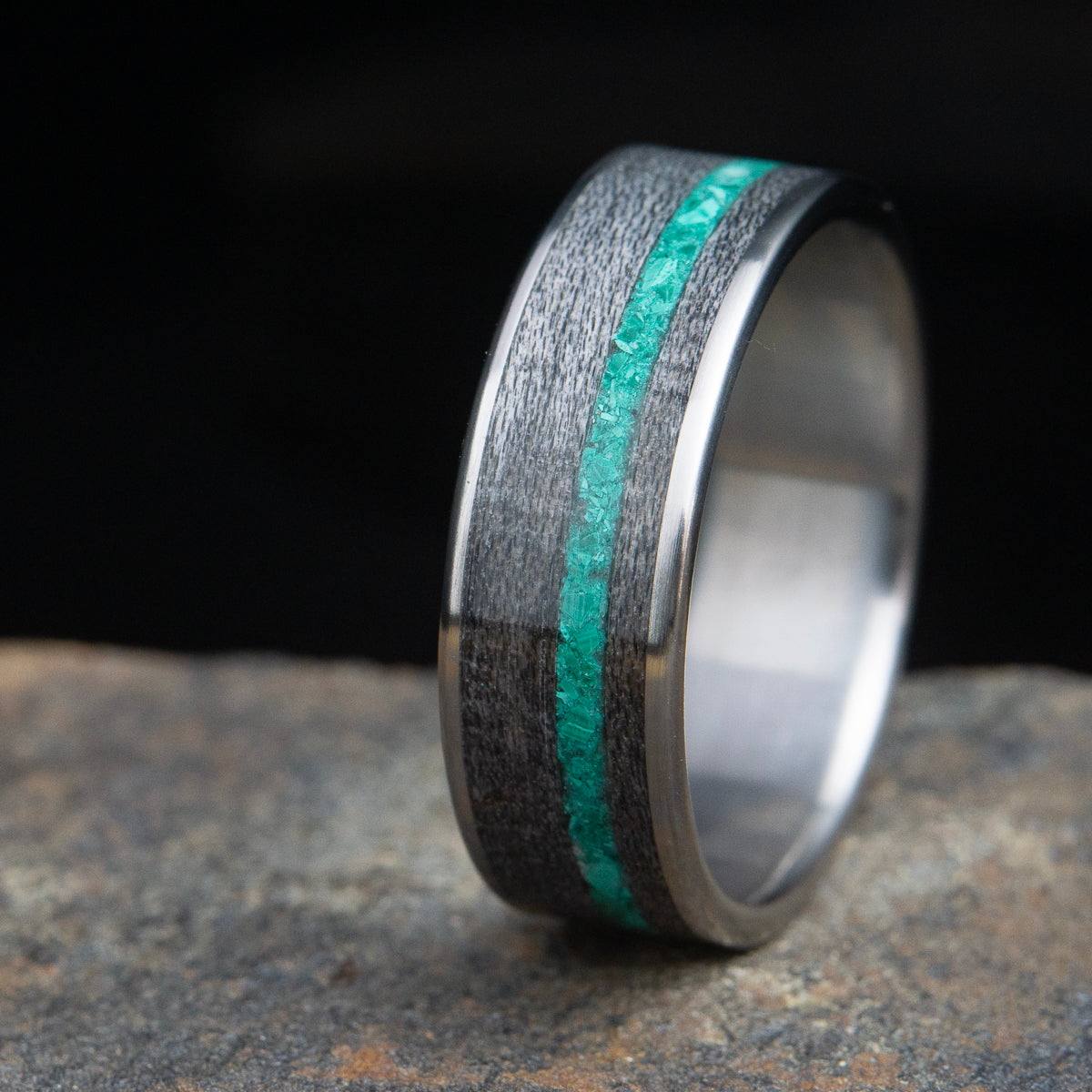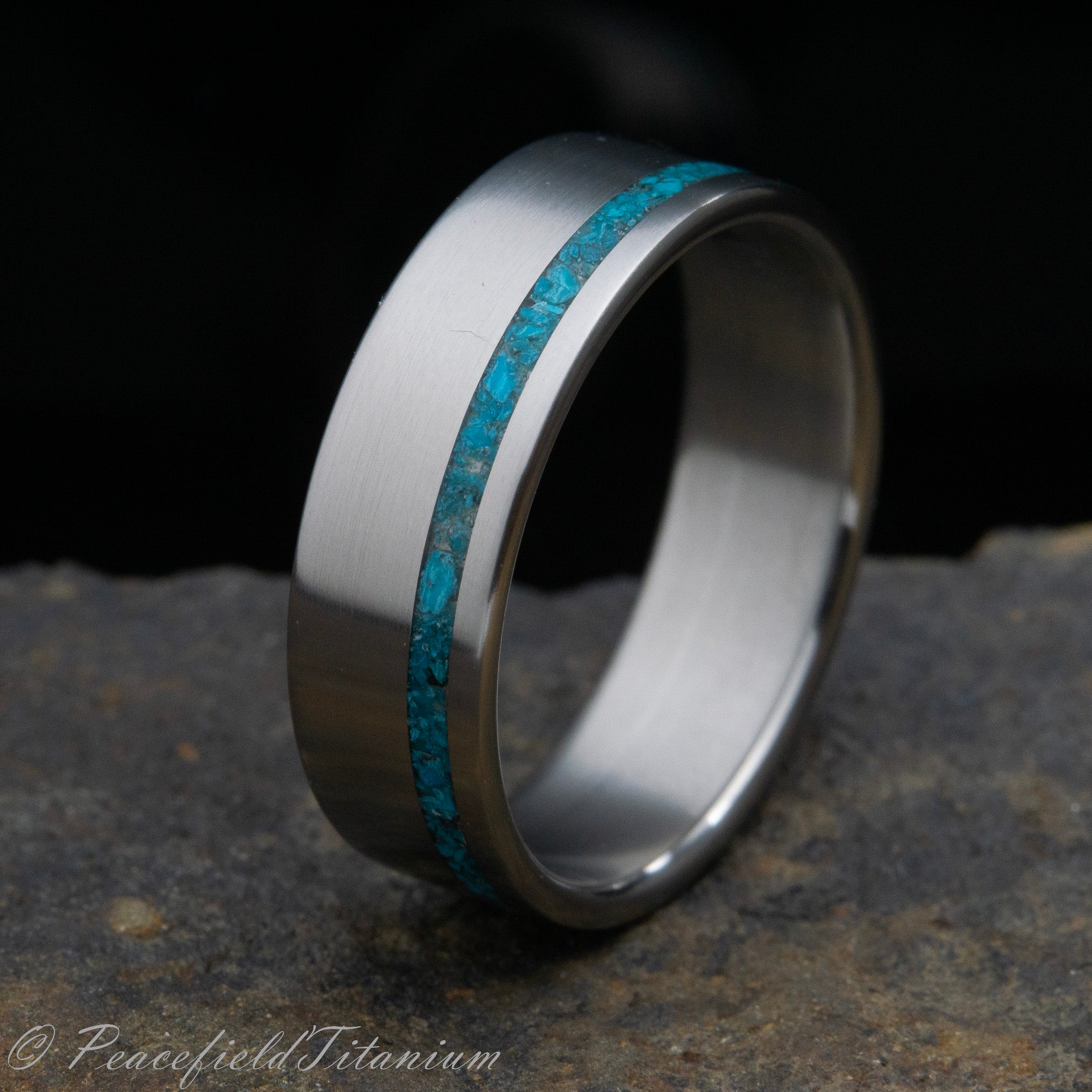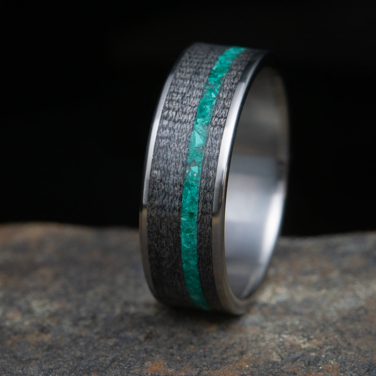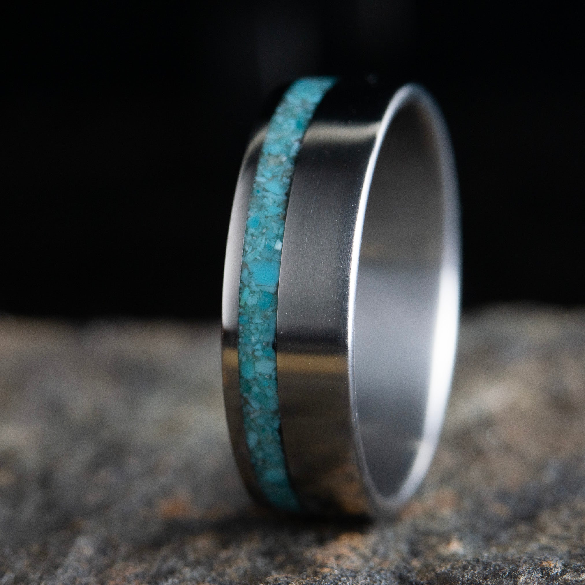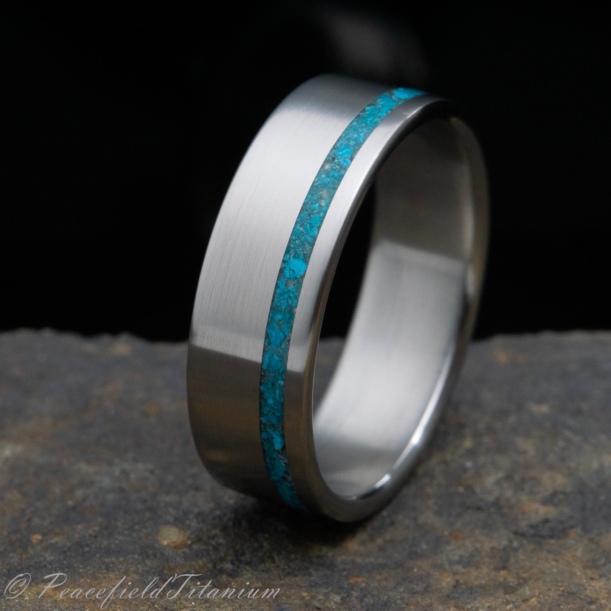 Our Titanium rings with natural stone inlays. These include rings with Malachite, turquoise, lapis lazuli, mother of pearl, and more. We are constantly adding fresh new wedding band styles to these collections. We pair up rings for wedding band sets and you can always combine two for your own personal touch.