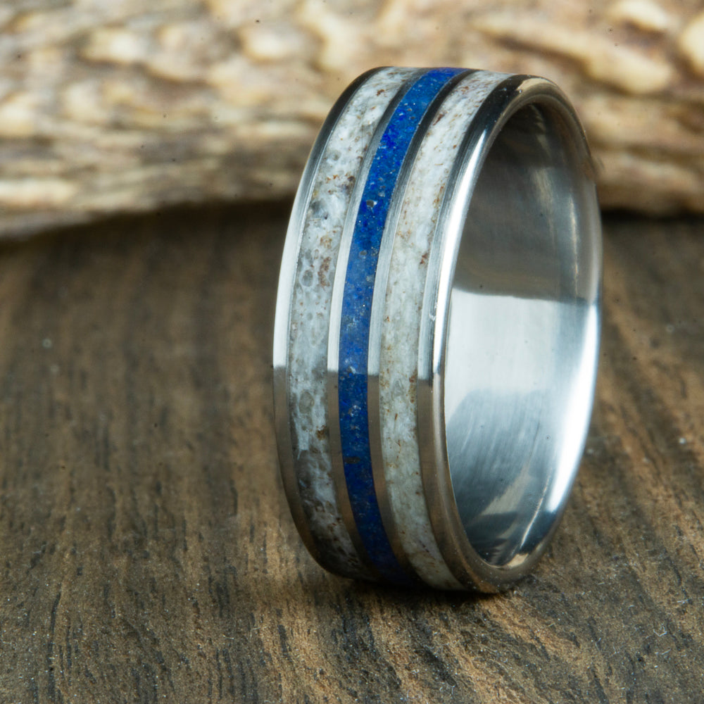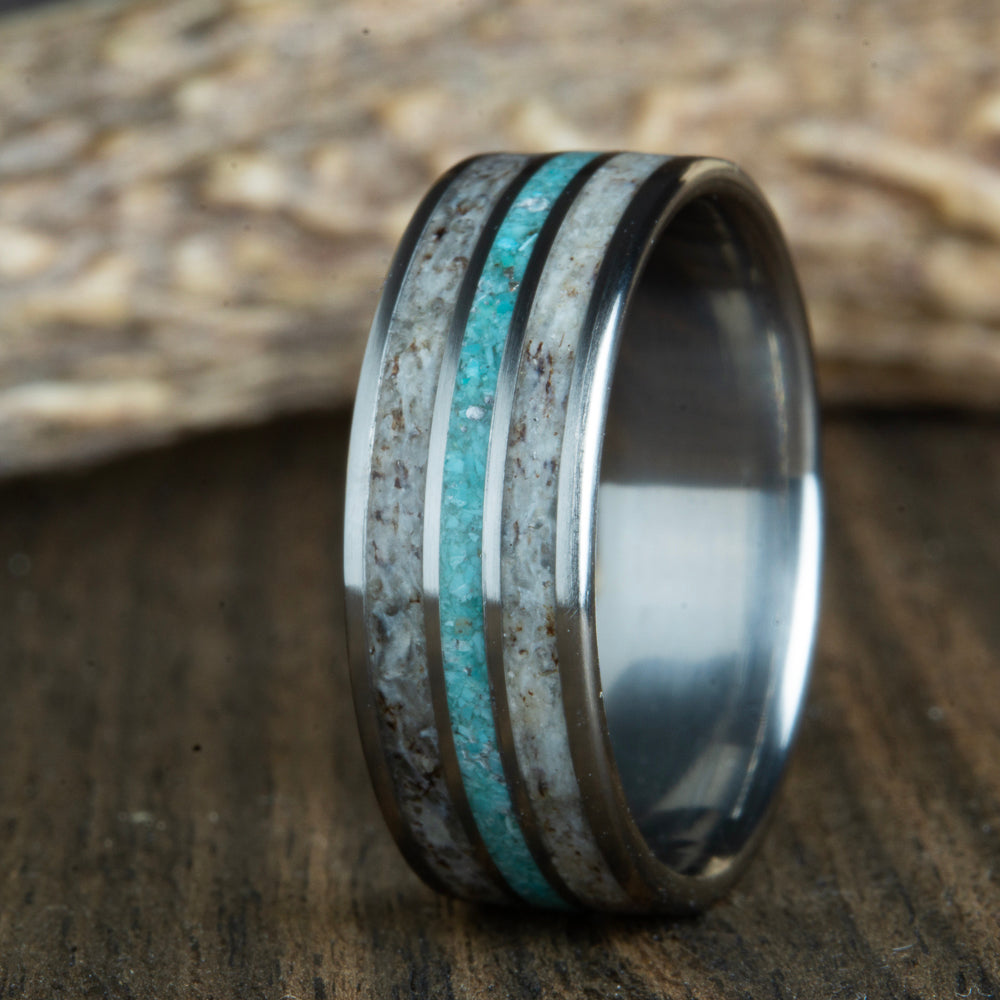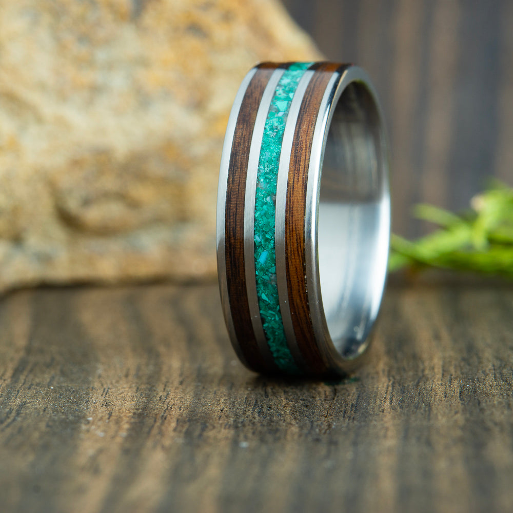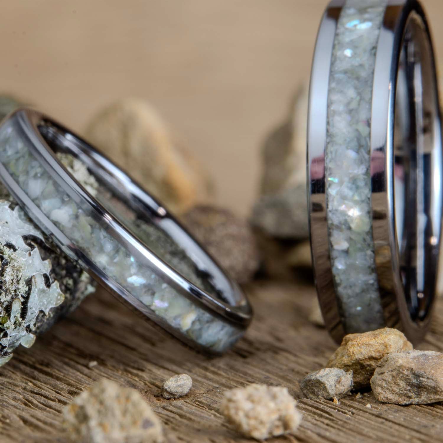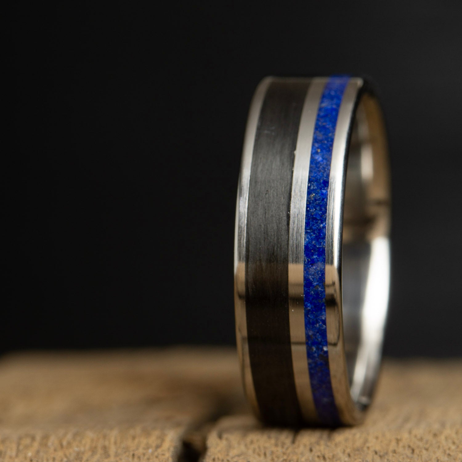 Our Titanium rings with natural stone inlays. These include rings with Malachite, turquoise, lapis lazuli, mother of pearl, and more. We are constantly adding fresh new wedding band styles to these collections. We pair up rings for wedding band sets and you can always combine two for your own personal touch.