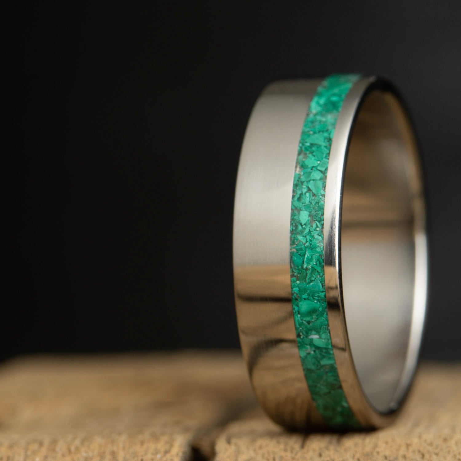 I love working with the Malachite stone. It has such a cool color and feel. We can add malachite to any of the other ring styles in our shop that have a different stone inlay. Feel free to contact us and we will be happy to make you a unique custom wedding ring using malachite.